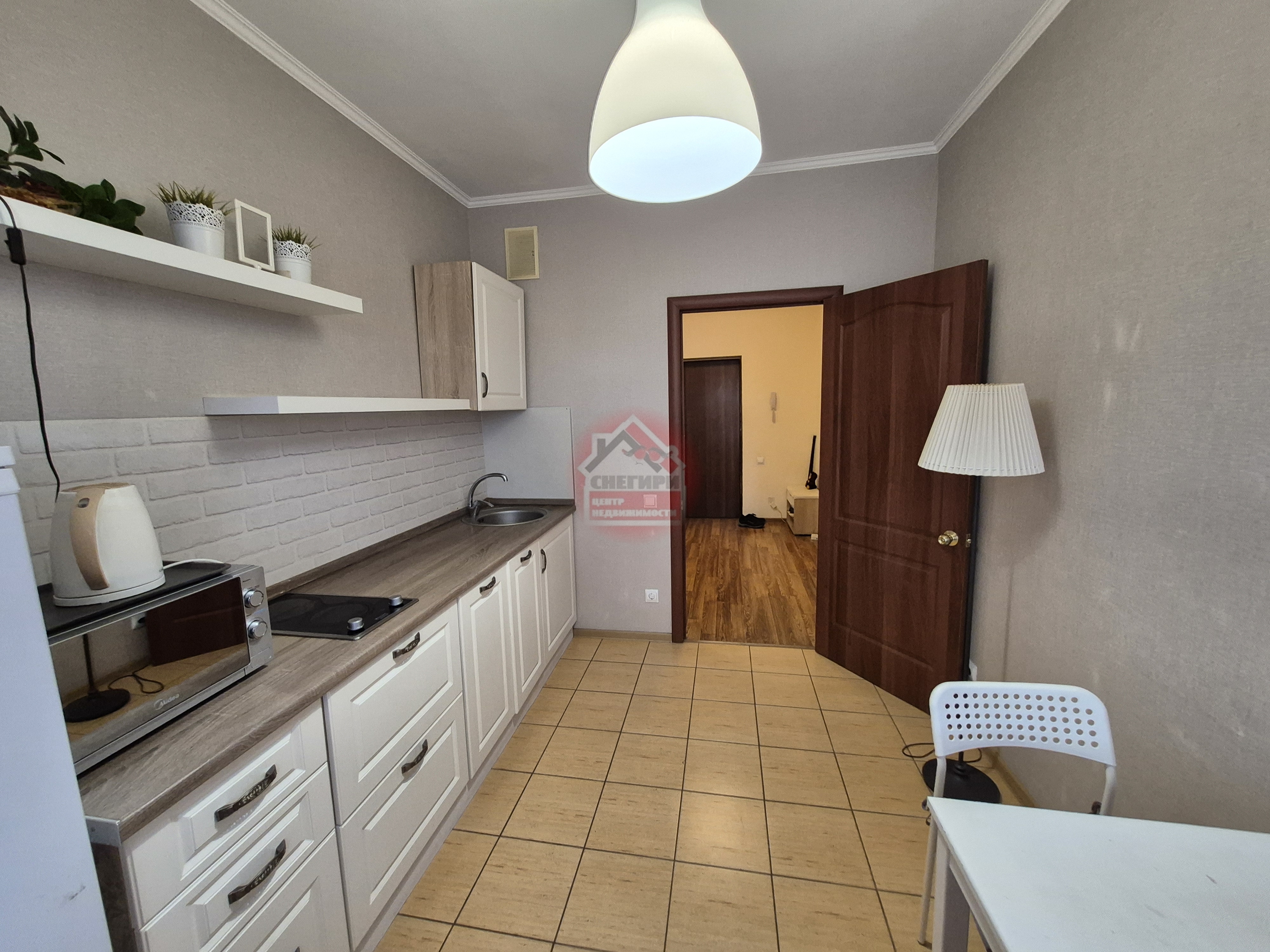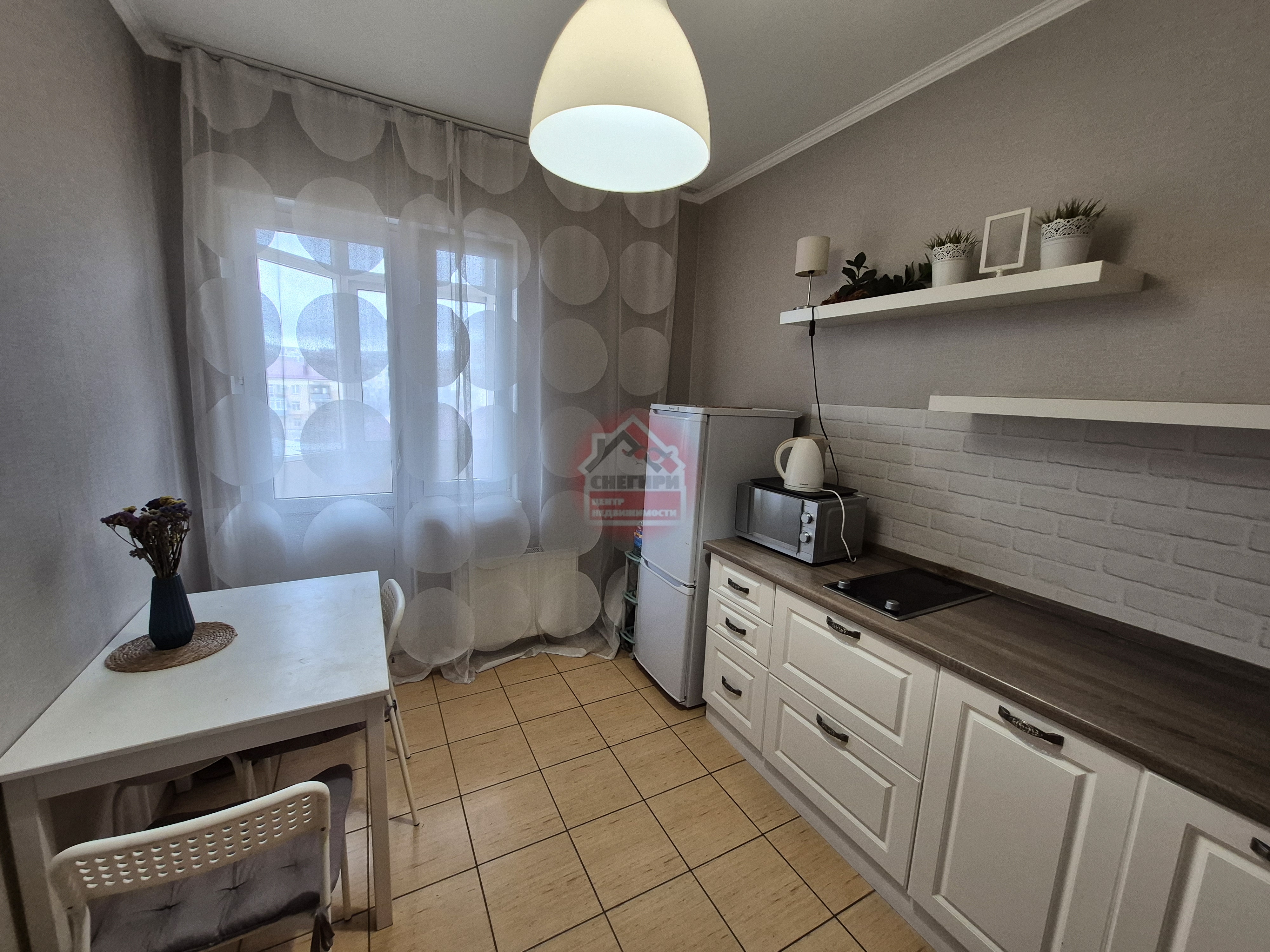Кухня оборудована современной техникой, включая холодильник, и выполнена в светлых тонах.