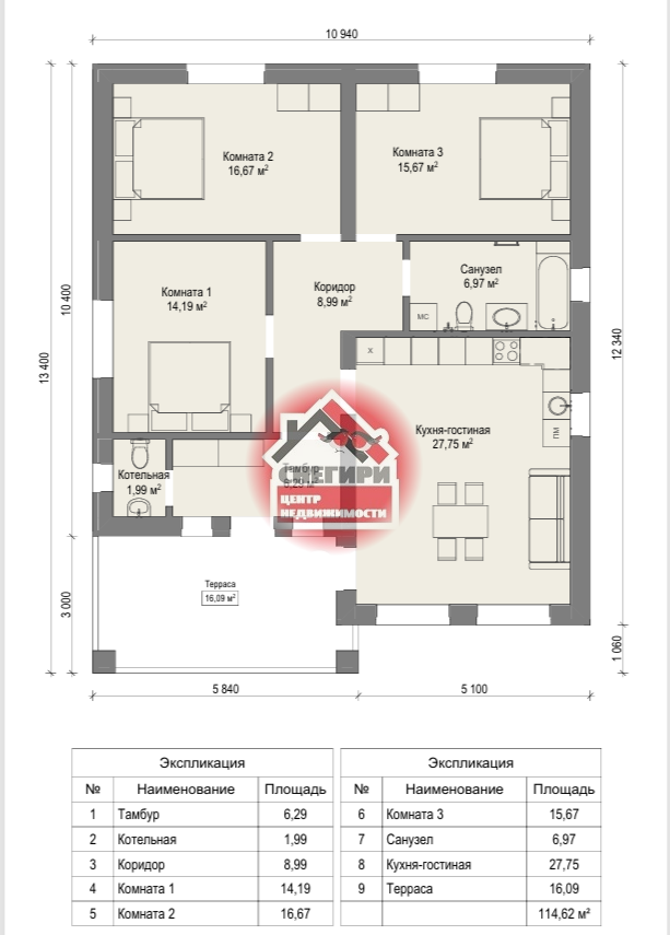 Просторный дом с функциональной планировкой (три изолированные комнаты; кухня-гостиная; два сан/узла; коридор; терраса под крышей).