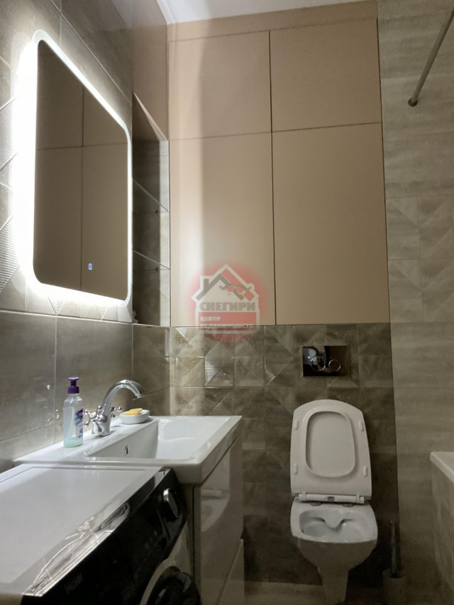 Санузел совмещенный, выполнен в светлых тонах, что придает ему свежесть и современность. установлена стиральная машина.