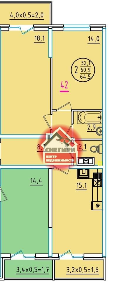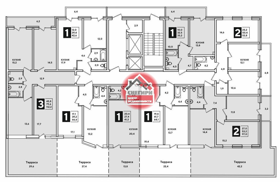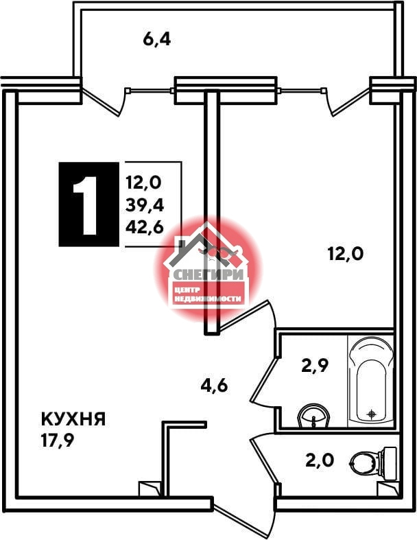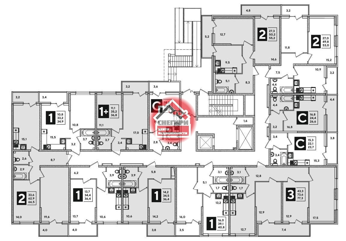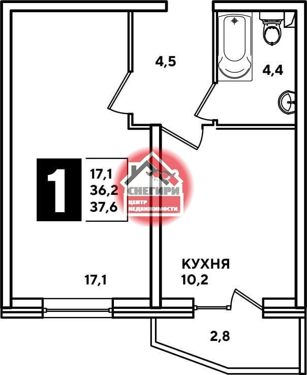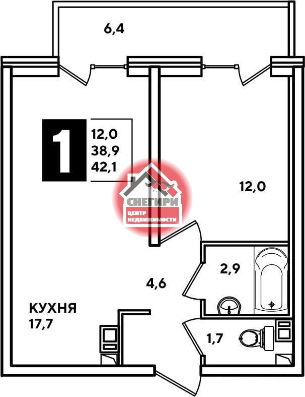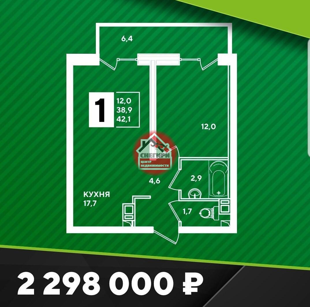 1-комнатные площадью от 29.9 кв.м. до 66.6 кв.м.,