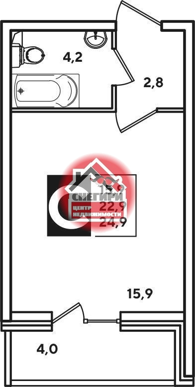 Площадь студий от 22.6 кв.м.. до 26.6 кв.м.,